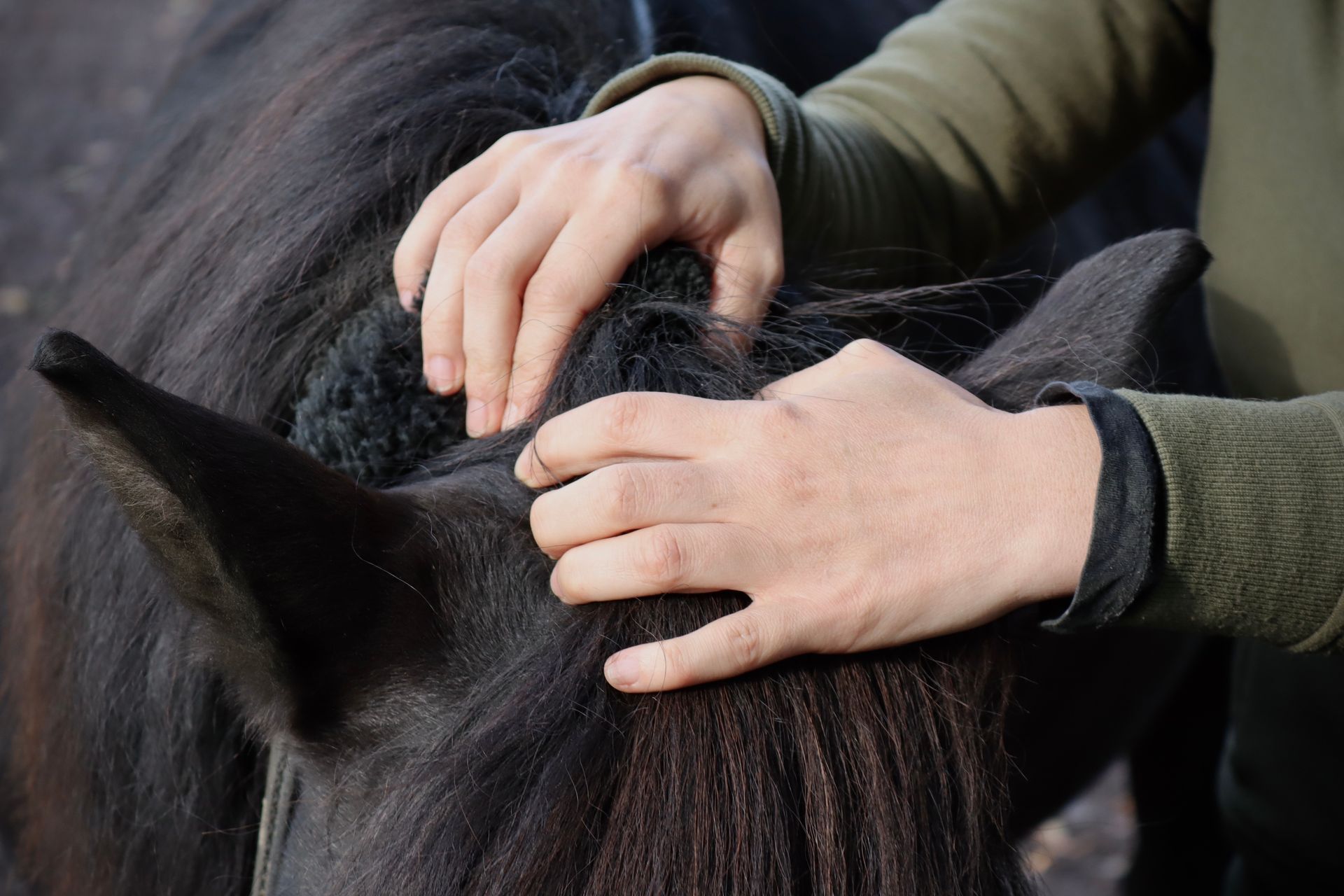 Die Behandlung findet an einem ruhigen Ort am Stall mit genügend Platz und einem ebenen Boden statt. Das Fell Ihres Pferdes sollte trocken und geputzt sein.